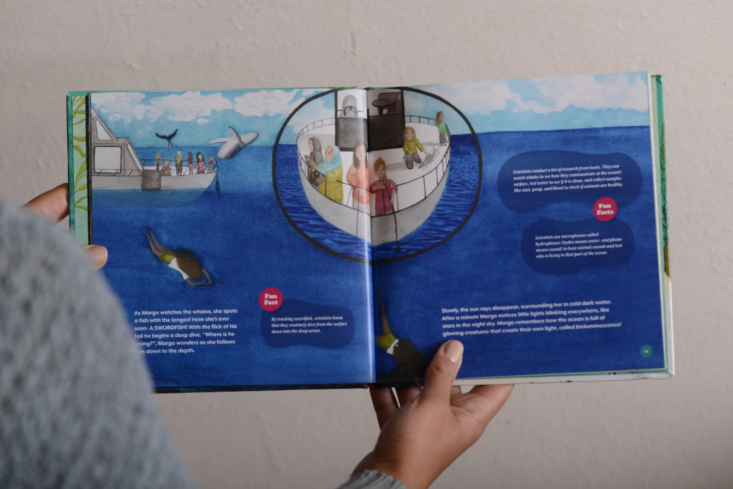 By following Margo—our curious guide—on her whimsical ocean adventure, readers learn that passion plus curiosity, not just background, define a scientist. The scientific narratives woven throughout our story and the scientific profiles, with illustrated portraits and short autobiographies at the back of our book, reinforce that ocean lovers of all identities can make a difference.